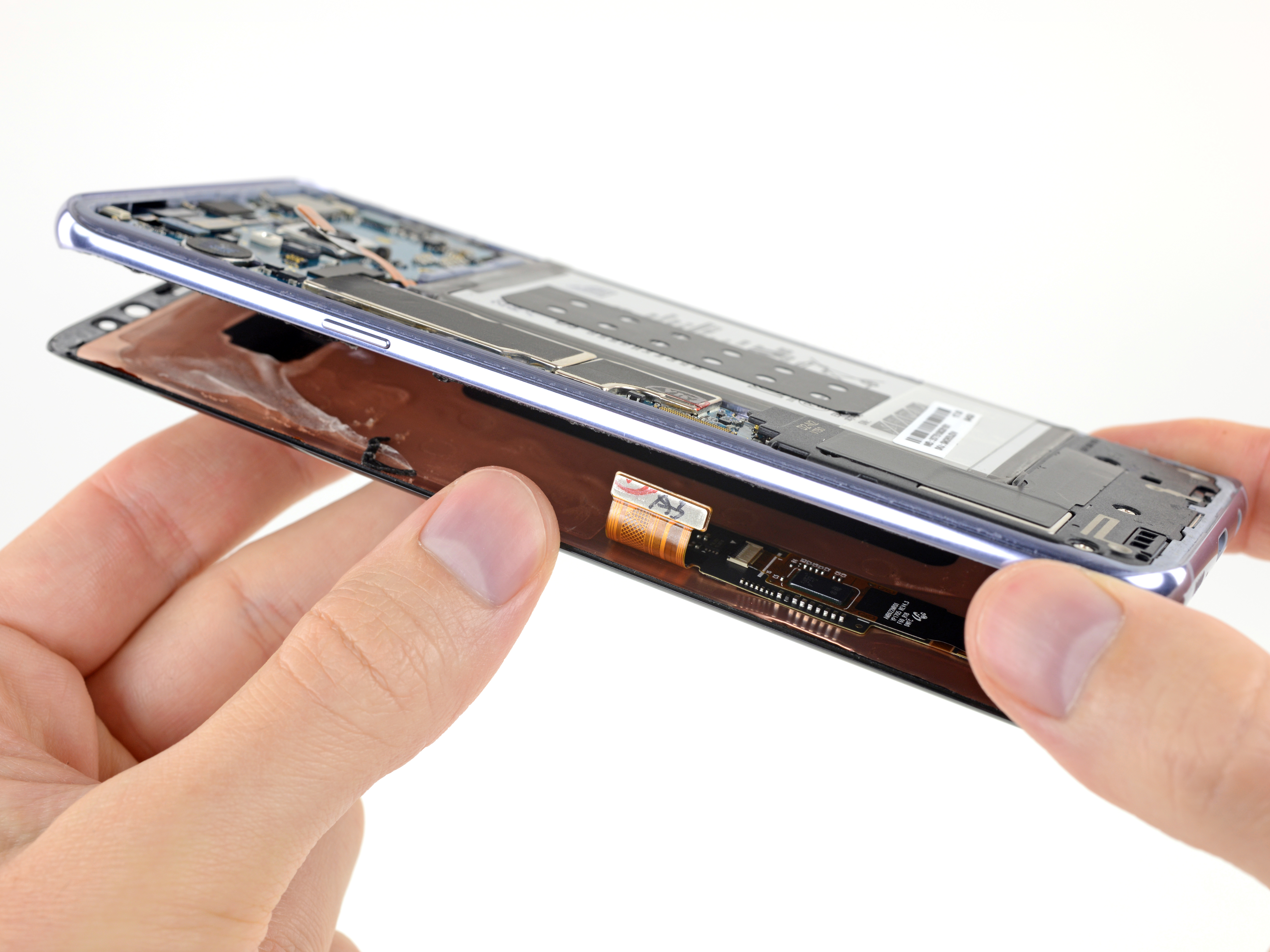 Evita hacer palanca o cortar en este área para proteger el cable flexible del sensor de huella digital.